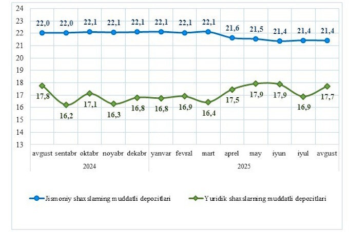 По данным Центрального банка, в августе средние процентные ставки по депозитам в сумах выросли и достигли 19,8% годовых. Этот уровень стал возвратом к майским показателям после двухмесячного снижения доходности.